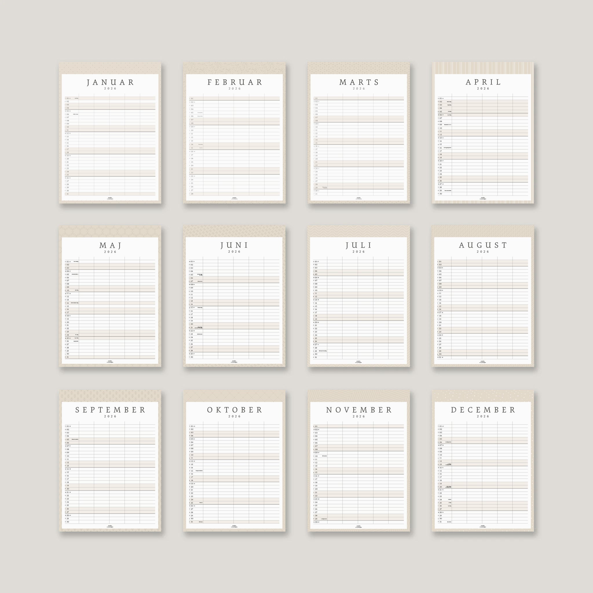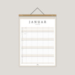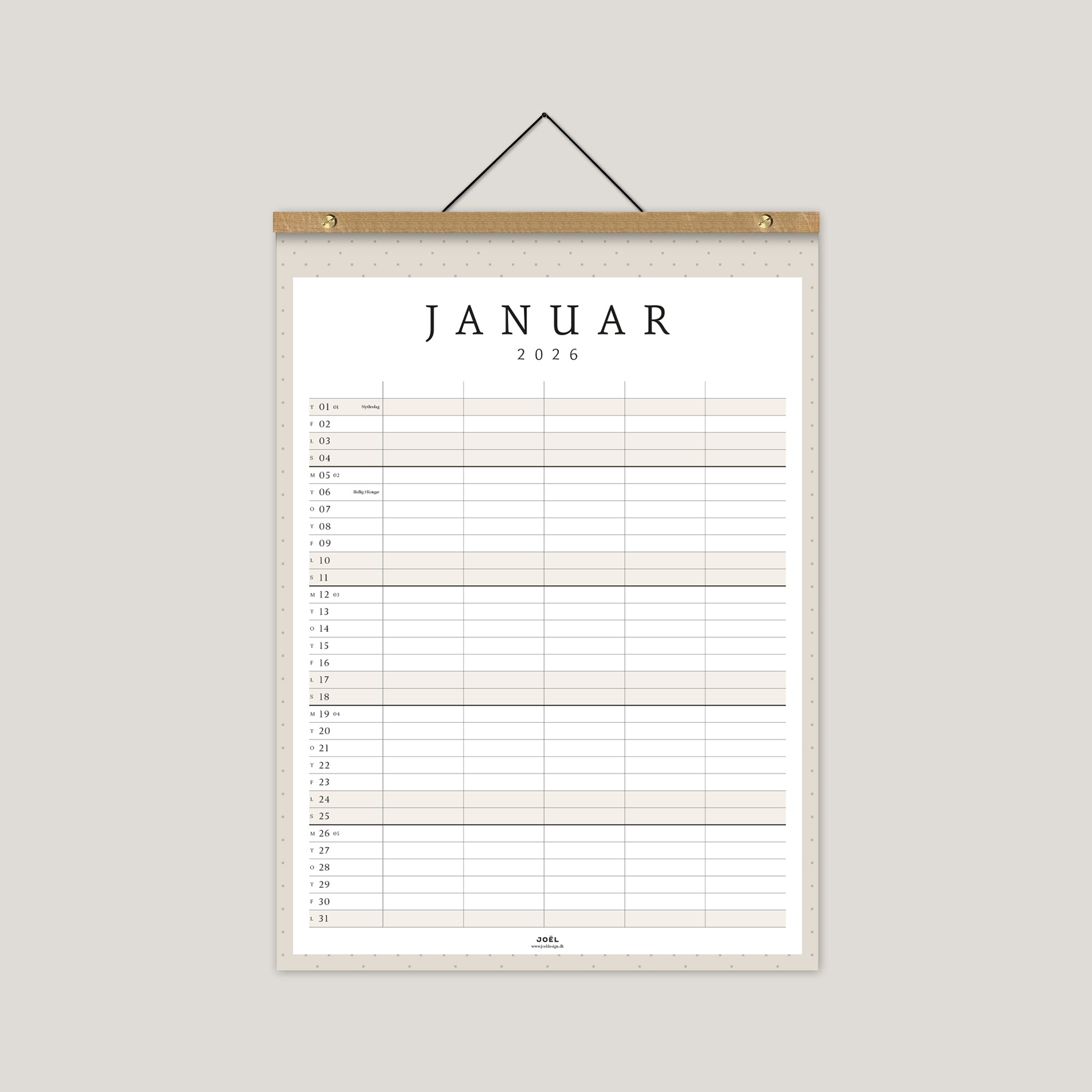 Denne vægkalender måler 50x70 cm og har et ark for hver måned, så du altid har plads til at holde styr på alle aktiviteter og opgaver. Med 5 kolonner kan hvert familiemedlem få sin egen plads, og hvis I ikke er 5 i familien kan de sidste kolonne bruges til fælles aktiviteter, madplan eller noget helt andet.