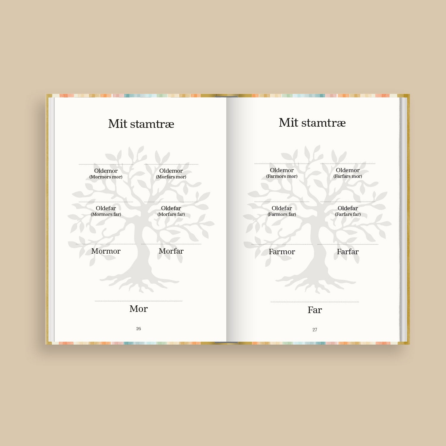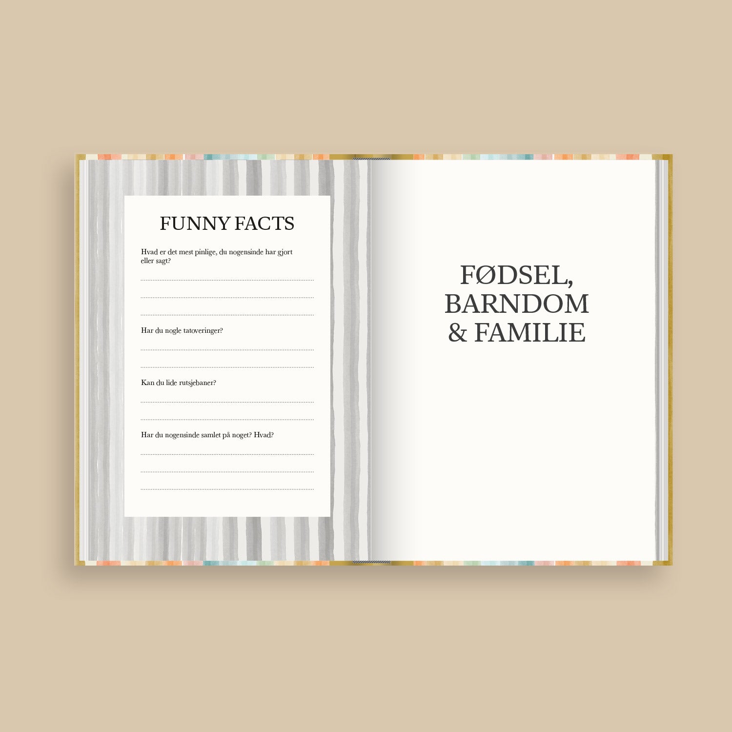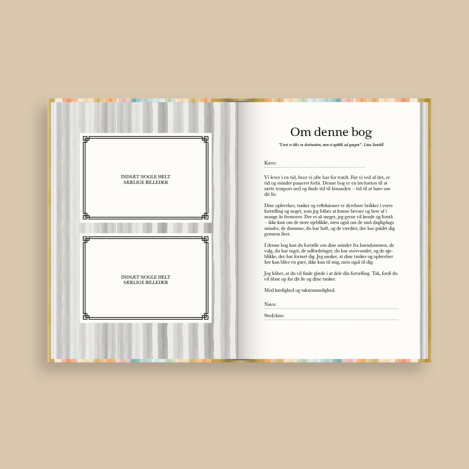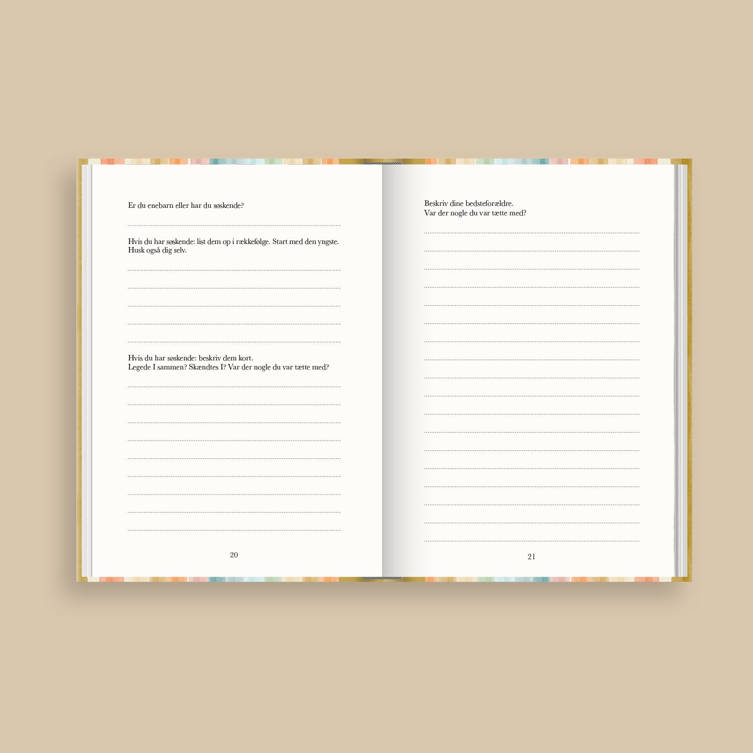 Vores bøger er designet med nøje udvalgte spørgsmål og skabeloner, der gør det nemt for alle at dele historier og minder. Man skal blot skrive svarerne, og bogen bliver til en personlig fortælling. Der er flere tomme sider hvor man selv kan tilføje mere