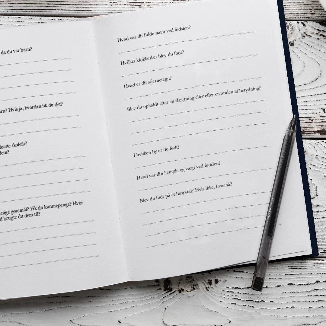 Vores bøger er designet med nøje udvalgte spørgsmål og skabeloner, der gør det nemt for alle at dele historier og minder. Man skal blot skrive svarerne, og bogen bliver til en personlig fortælling. Der er flere tomme sider hvor man selv kan tilføje mere